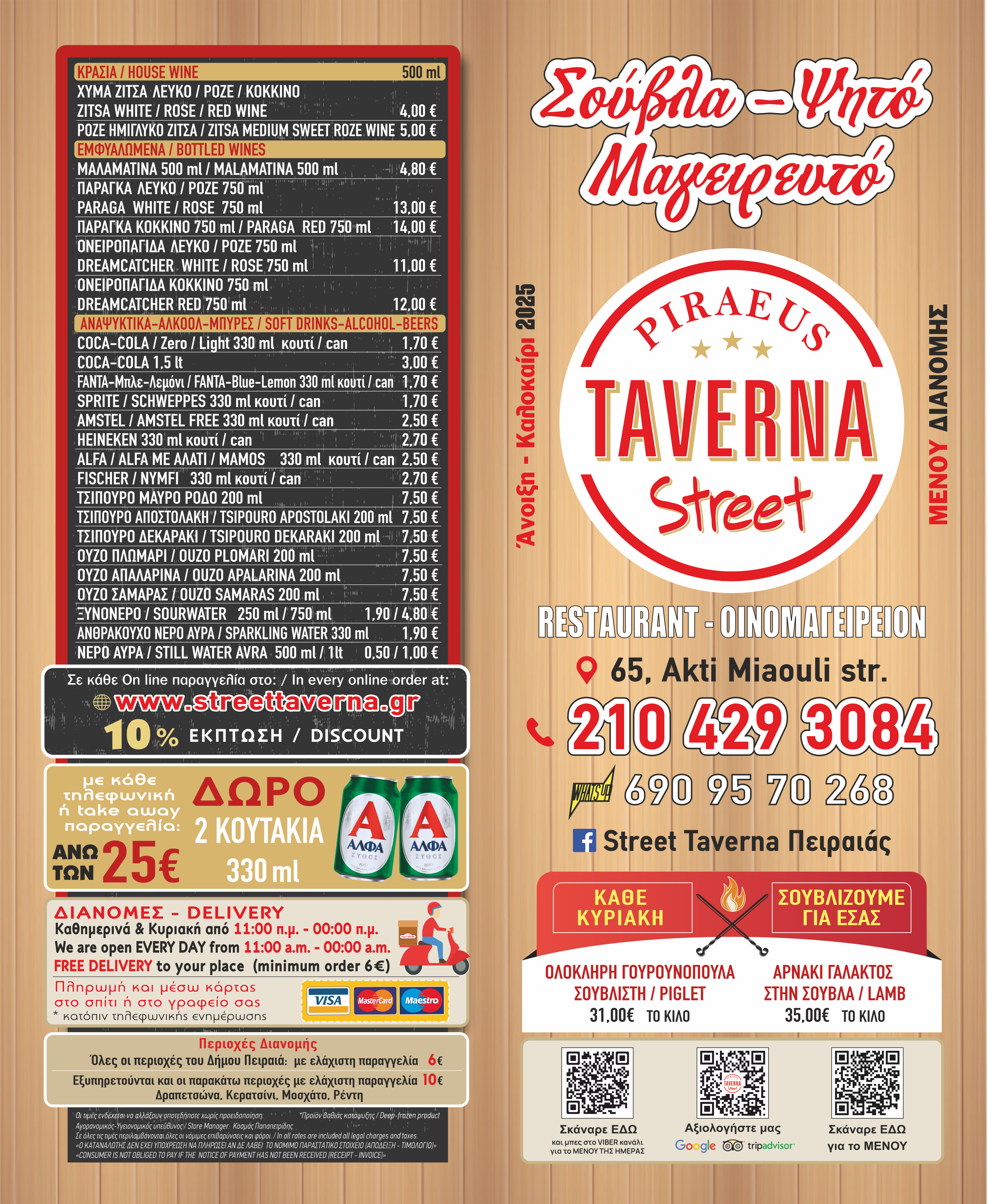 Street Taverna is a new member of the STREET restaurant family. We have created a traditional tavern with the aesthetics of the Street and a menu based on our Greek culture and taste. Multiple spits start early in the morning to simmer chicken, piglets, kontosouvli, chicken, country house and whatever your heart desires. Our grills are ready for the dishes of the hour such as brisket, stables, liver, sausages, etc.